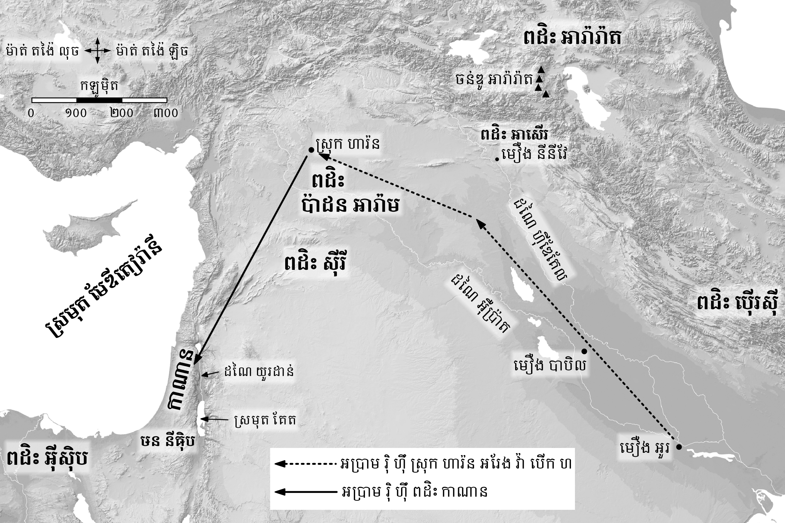 ទីរ៉ា ពឝ៉ើត អប្រាម ណាខូរ វ៉ា ហារ៉ន។ អ៊ែ ហារ៉ន ពឝ៉ើត ឡុត។
