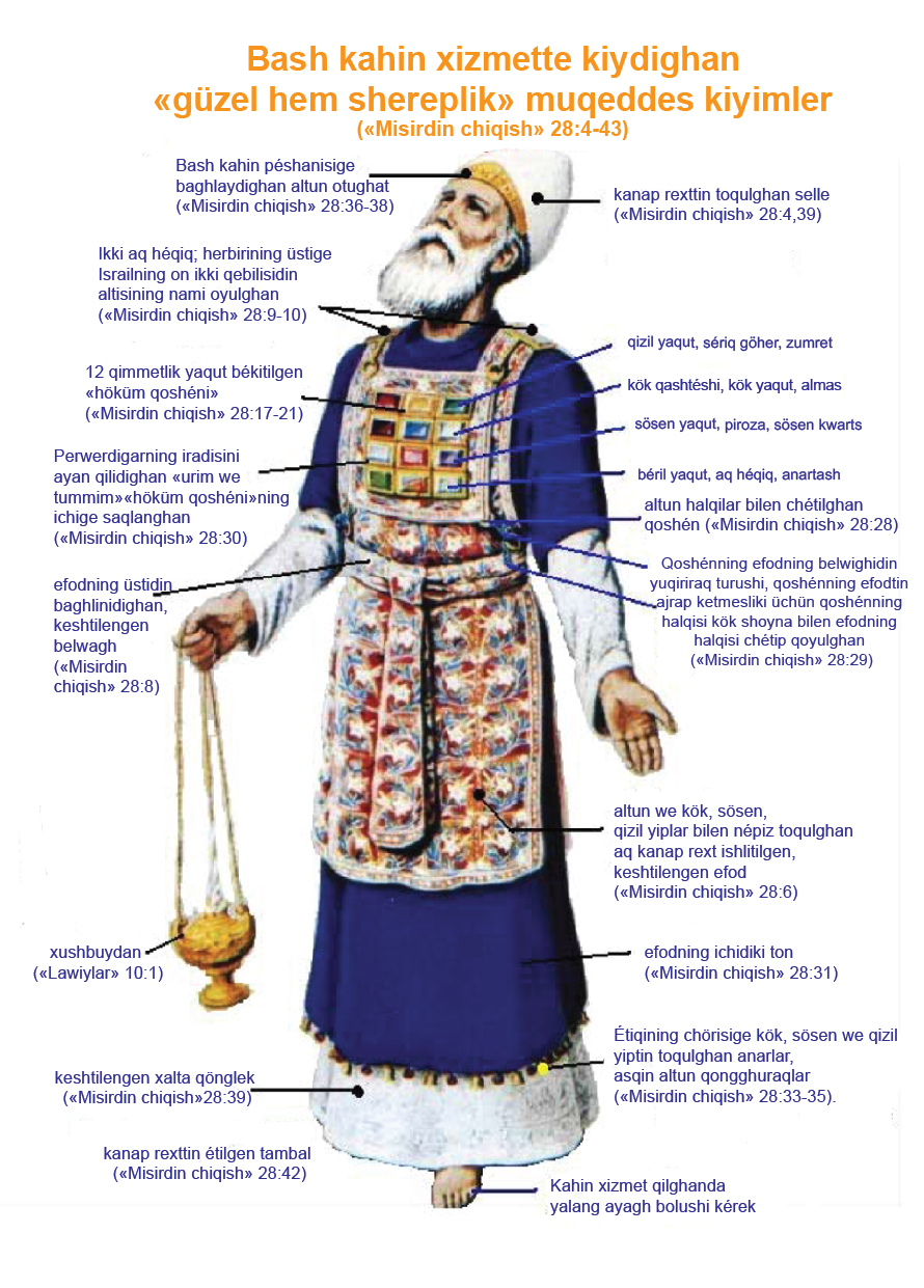Perwerdigar Musagha buyrughinidek kök, sösün we qizil yiplar ishlitilip, muqeddes chédirning xizmitide kiyilidighan kahinliq kiyimler, shundaqla Harunning muqeddes kiyimliri teyyar qilindi. ◘